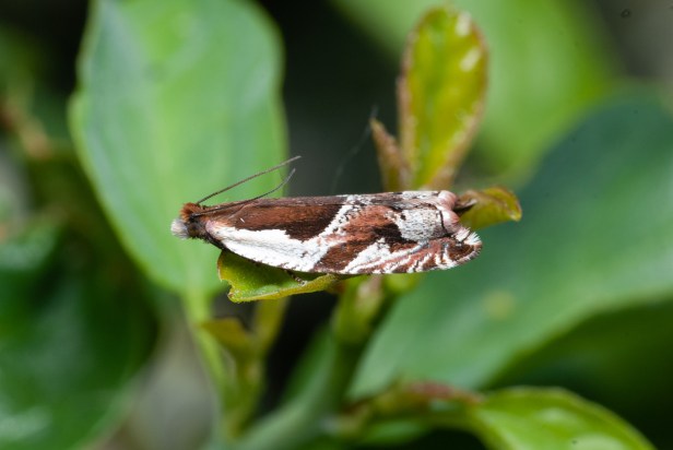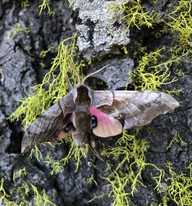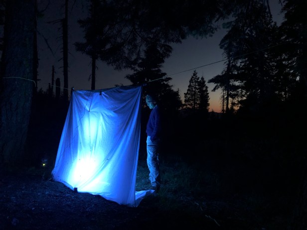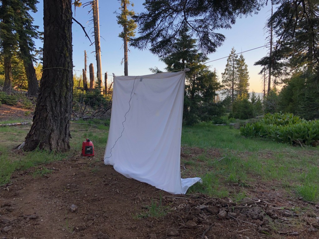The battery itself is a small 12V battery that can hold a charge with the UV light on for about 6-8 hours and was placed into a small box that kept the exposed connectors and wires protected from the elements. Once the light was connected to the battery, the light was placed horizontally on top of the bucket and left alone for the rest of the night. We also ended up deciding to go with acetone as the knockdown agent for the insects that flew into the trap. We had the moth sheet light on for a few hours, but the bright moon made for some very lackluster collecting and we ended up turning in early. There were only a few notable species that made it to the sheet that night and one of which was actually a first for me.